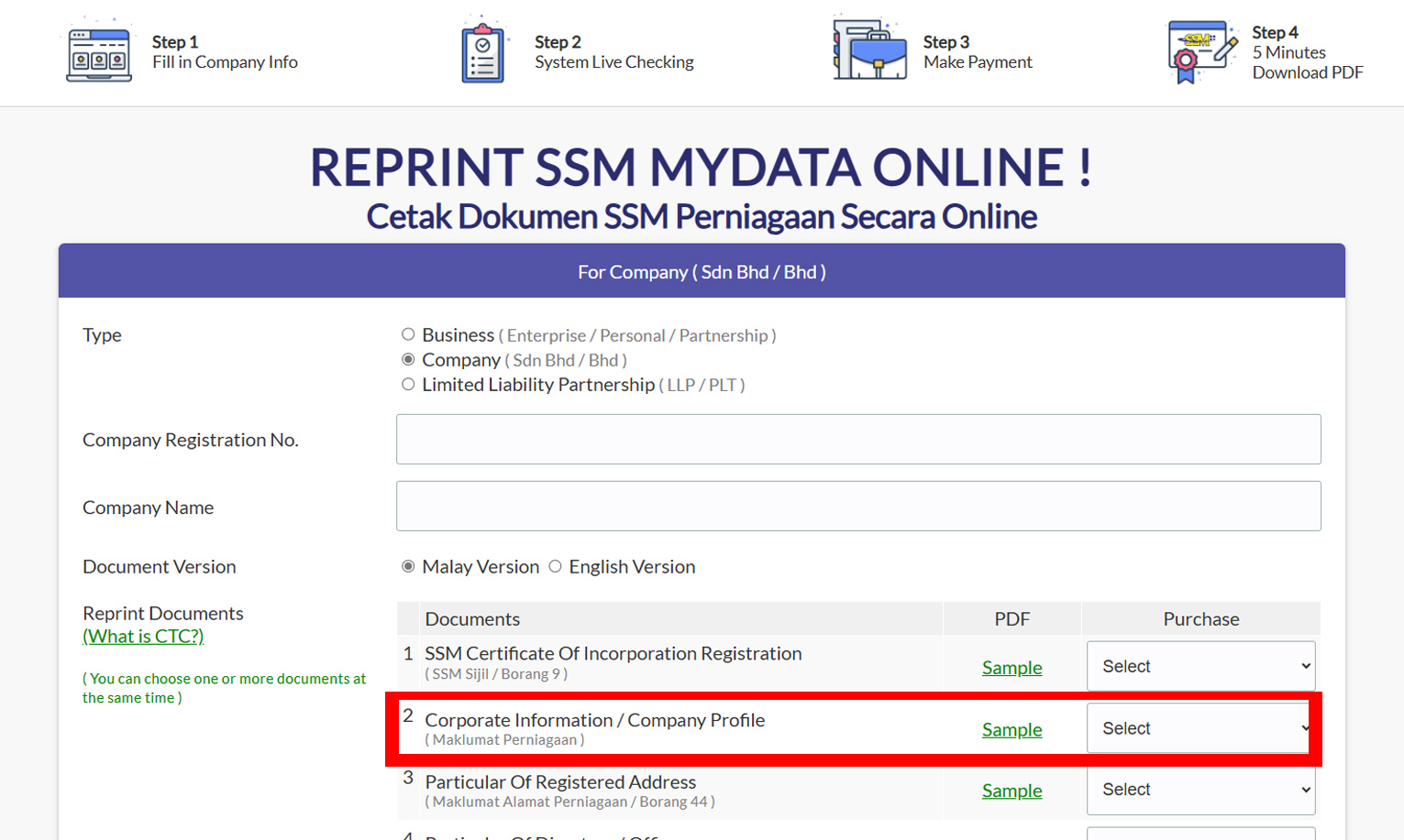 Cara Mendapatkan atau Muat Turun Profil Syarikat Sdn Bhd Terkini (Borang Super)Anda boleh mendapatkan profil syarikat anda dengan tarikh cetakan terkini dalam masa 5-10 minit dari: