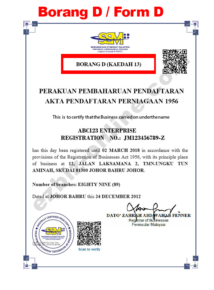Borang D (Sijil Pendaftaran Perniagaan)• Dikeluarkan apabila anda mendaftarkan perniagaan baharu dengan SSM.